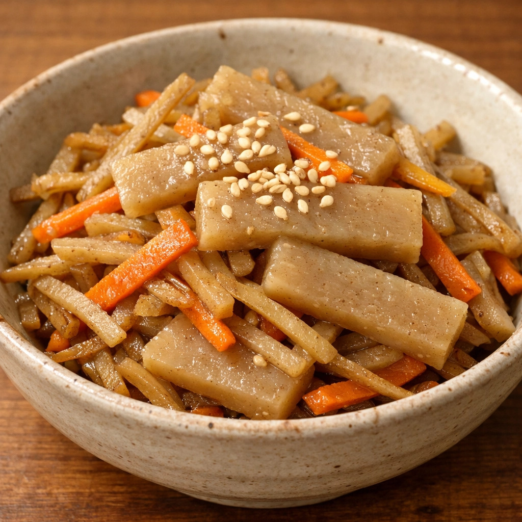 ごぼうや人参と一緒に炒めることで、生芋こんにゃくのシャキシャキとした食感が際立ちます。彩りも豊かで、食卓が華やぎます。